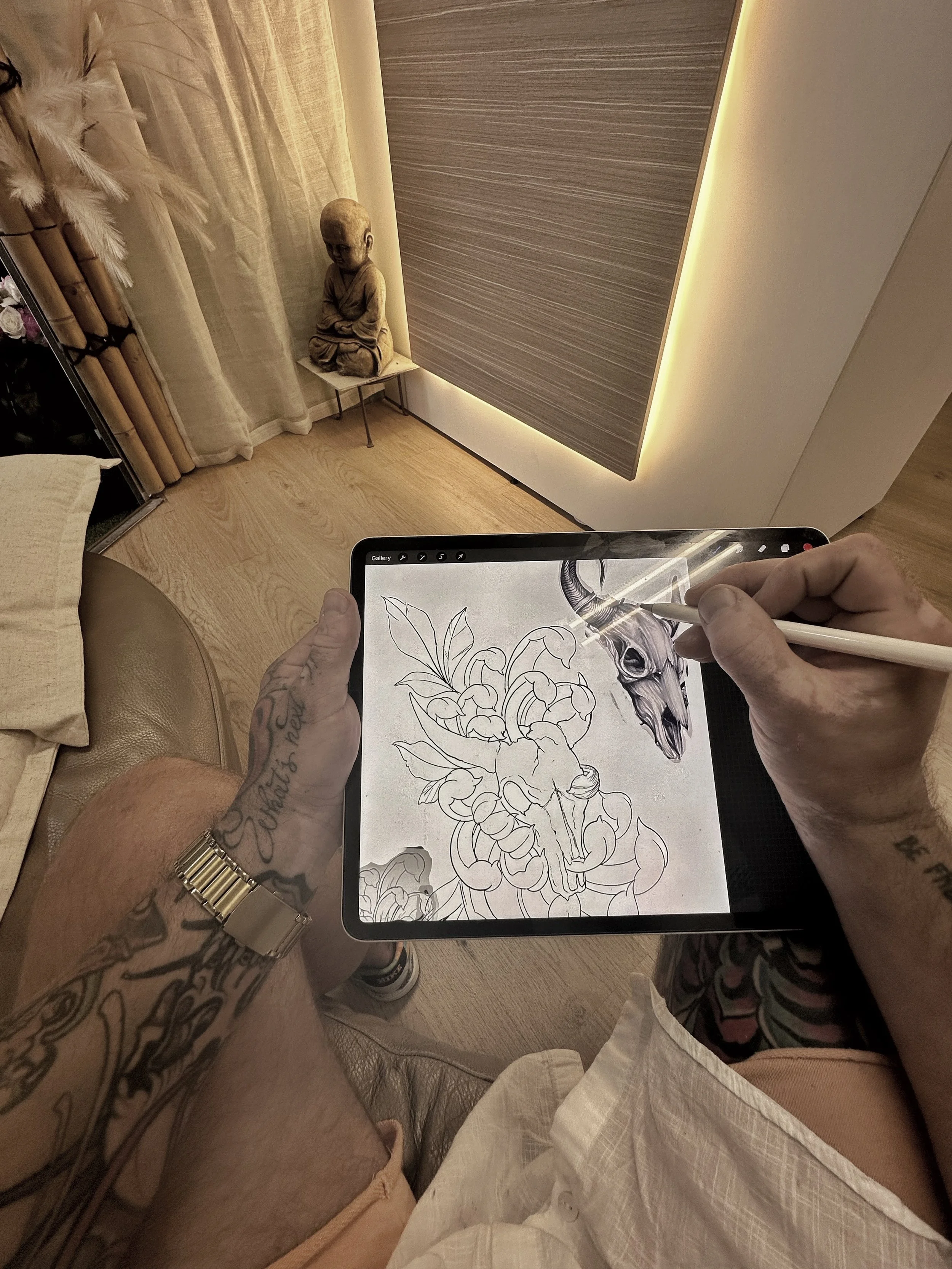 During a consultation we collect or research the right reference images with you. We do a draft for your design on the spot. After we take photos of requested body part we are able to illustrate on digital surfaces how your tattoo will look and take place on your body. We provide this visual plan for free and keep working on it with you until perfection, when your tattoo can be started.